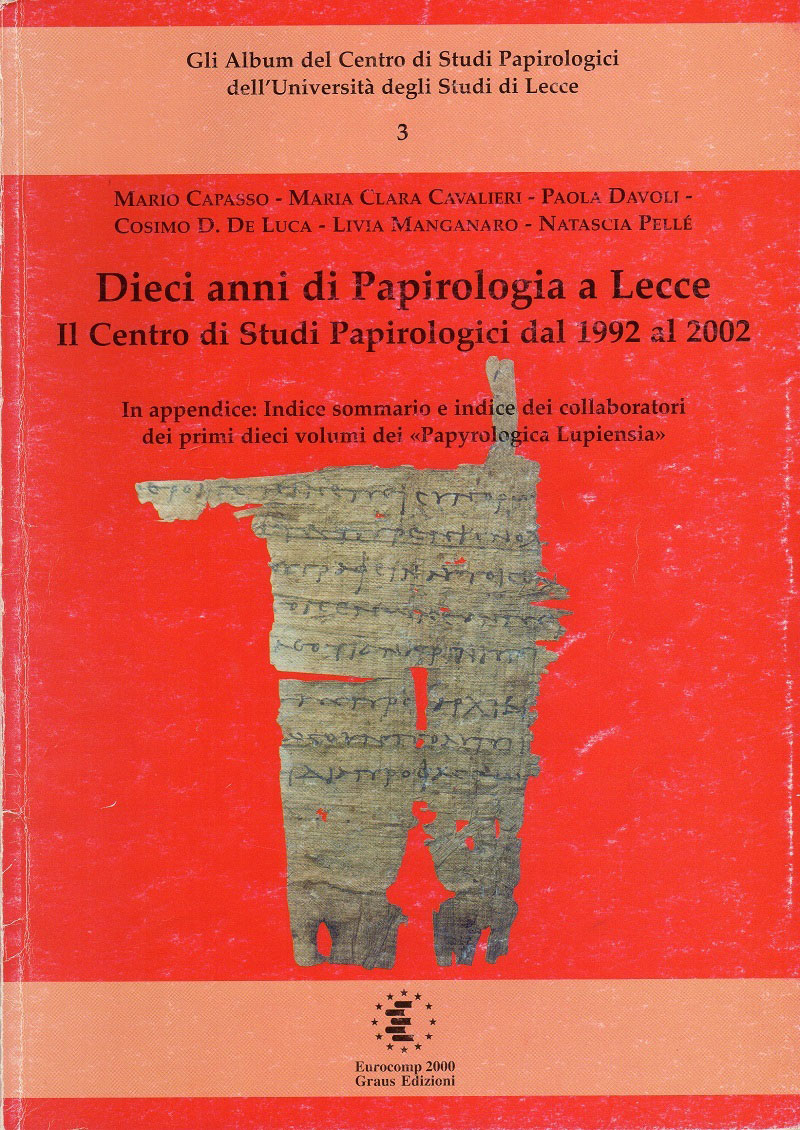 Dieci anni di Papirologia a Lecce. Il Centro di Studi Papirologici dal 1992 al 2002 (Gli Album del Centro di Studi Papirologici dell’Università degli Studi di Lecce, 3), Napoli, Eurocomp 2000, 2002. ISBN: 88-8346-021-9.